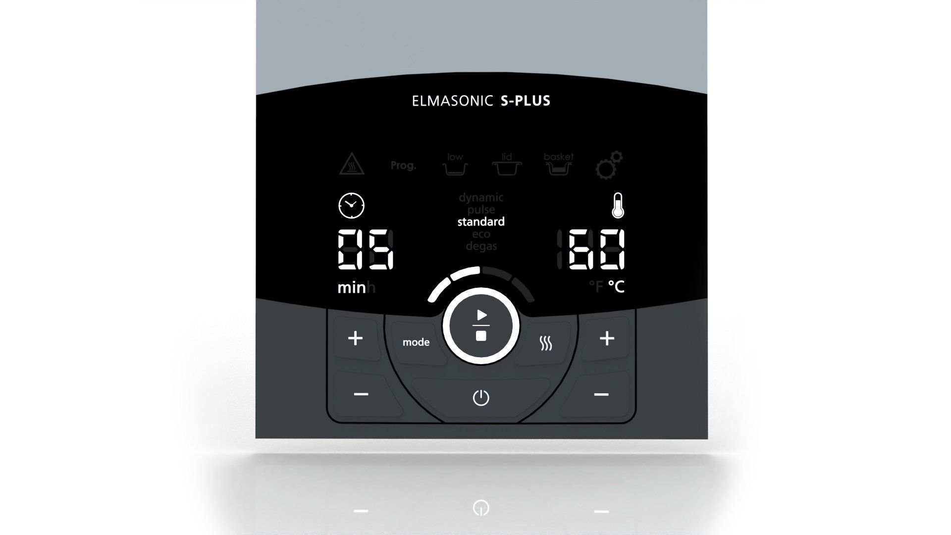 Im Redesign der Bedieneinheit haben wir Display und Bedienelemente zu einer durchgängigen, optisch integrierten Fläche verbunden. Zeit- und Temperatureinstellungen sind seitlich klar angeordnet, während die Reinigungsmodi zentral über eine kreisförmige Steuerzone geführt werden – abgeleitet von der visuellen Sprache der Ultraschallwellen.